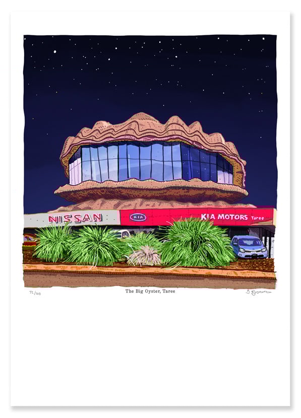 The Big Oyster, Taree, NSW Land of the Bigs The Big Oyster, Taree. Erected in 1990 to celebrate Taree's oyster industry, this orphaned mollusc began life as a themed restaurant, then a gift shop, and now sits perched above a car dealership. (I don't know about you, but I always think 'oysters' when buying a new car.)