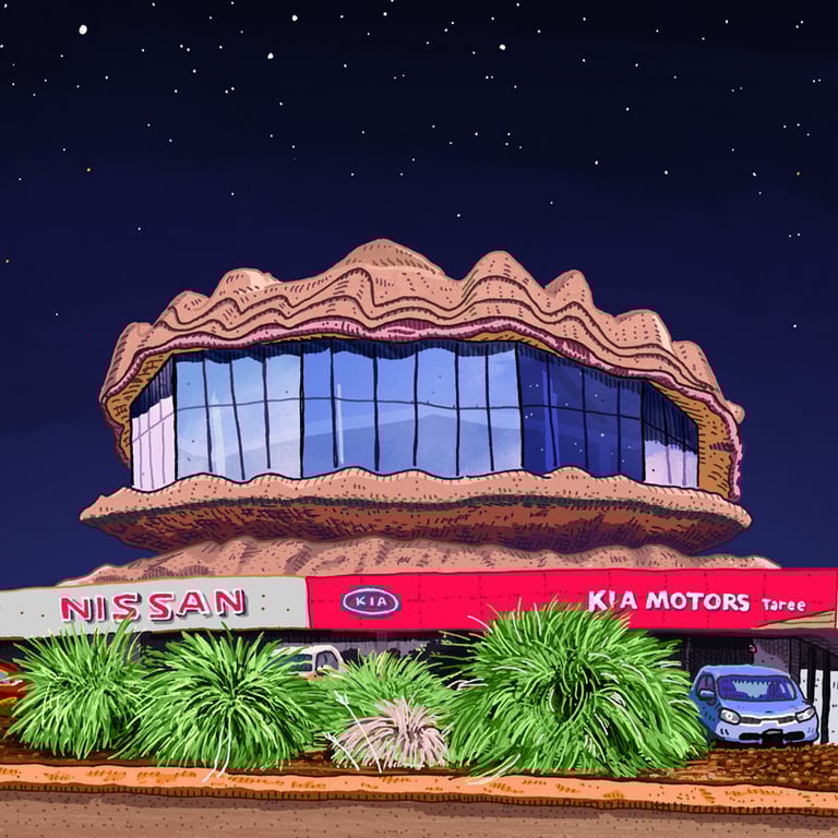 Taree’s Big Oyster, 100 Manning River Drive The Big Oyster, Taree, NSW - Land of the Bigs Even though he was never completed, abandoned within years of opening, and now houses a car dealership, the outrageously oversized Big Oyster is a real pearler! He's enormous, goofy, overblown, tragic, beautiful and repulsive - and that's what we all love about our Bigs!