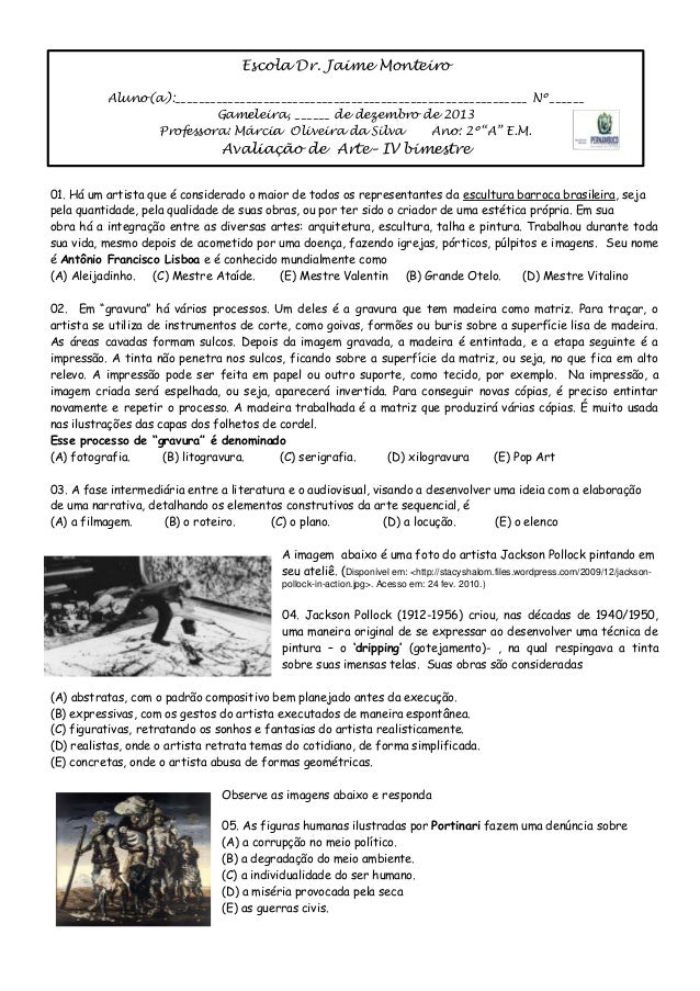 Atividade De Arte Para O 3º Ano EDUCA 1º Ano Ensino Médio Simulados de Artes Simulados Enem. Simulado de Artes para 1º Ano com 40 questões com gabarito. Estude para o Enem ou para o Ensino Médio. Pratique respondendo às perguntas de Artes. O simulado é bem simples, por conta disso recomendamos ser aplicado no 1º bimestre do 1º Ano.