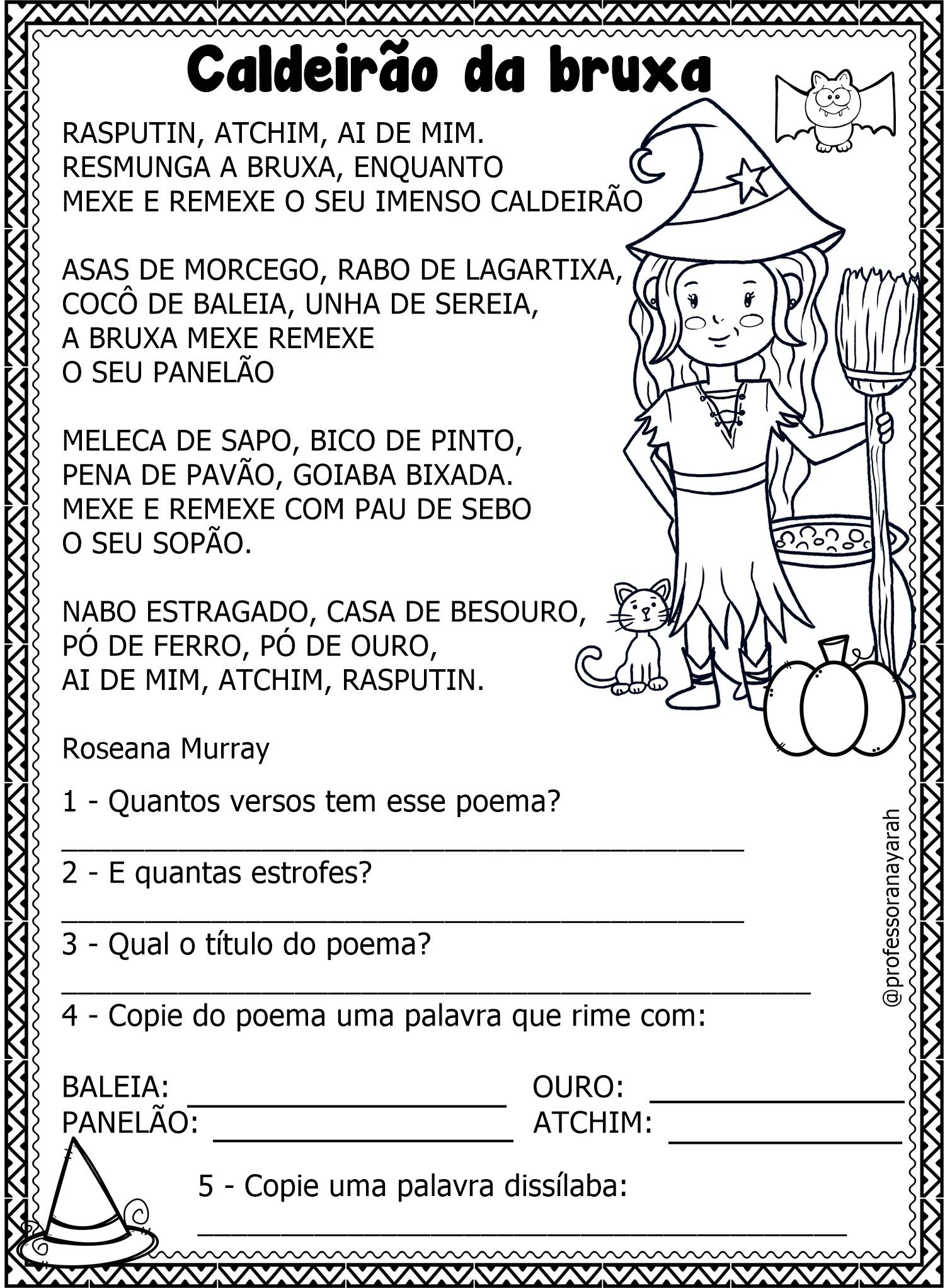 Espaço do Saber Atividade dia das bruxas Atividades de alfabetização. Chegou o mês de Outubro e nada melhor que inovar as aulas com estas Atividades para dia das bruxas para o 1º ano do ensino fundamental. Portanto o objetivo destas Atividades para dia das bruxas é despertar nos alunos em realizar a leitura do poema e depois ilustra-lo. O poema O caldeirão da bruxa traz pequenos.