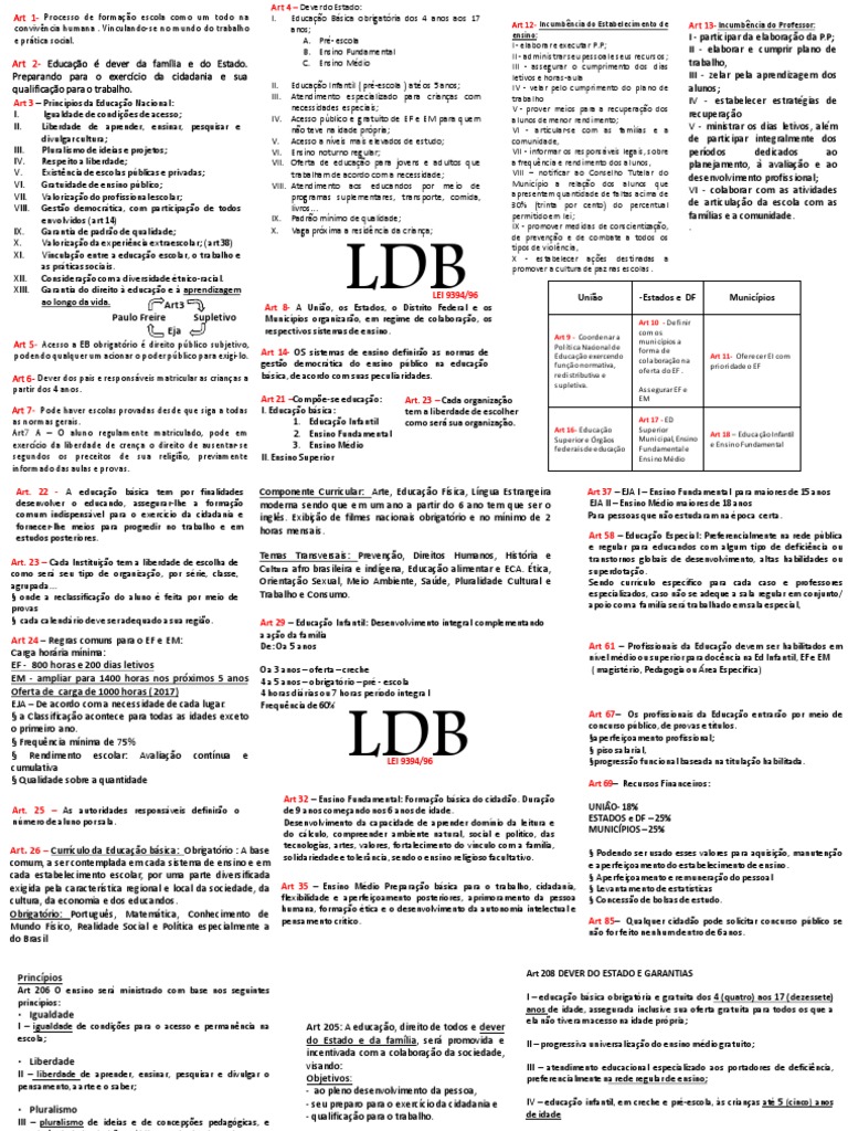 Mapa mental sobre art. 14 ao 18 da LDB Lei de Diretrizes e Base da A LDB- Lei de Diretrizes e Bases da Educação Nacional, a Lei 9394/96, também é conhecida como Lei Darcy Ribeiro. É a mais importante lei do sistema educacional, pois traz as diretrizes gerais da educação brasileira, seja ela pública ou privada.