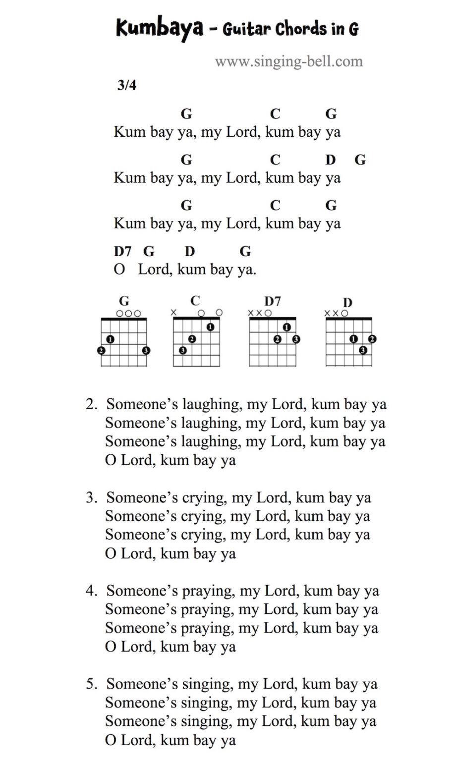 Kumbaya Chords, Sheet Music, and Tab for Guitar with Lyrics Kumbaya - Guitar Chords in G 3/4 G C G Kum bay ya, my Lord, kum bay ya G C D G Kum bay ya, my Lord, kum bay ya