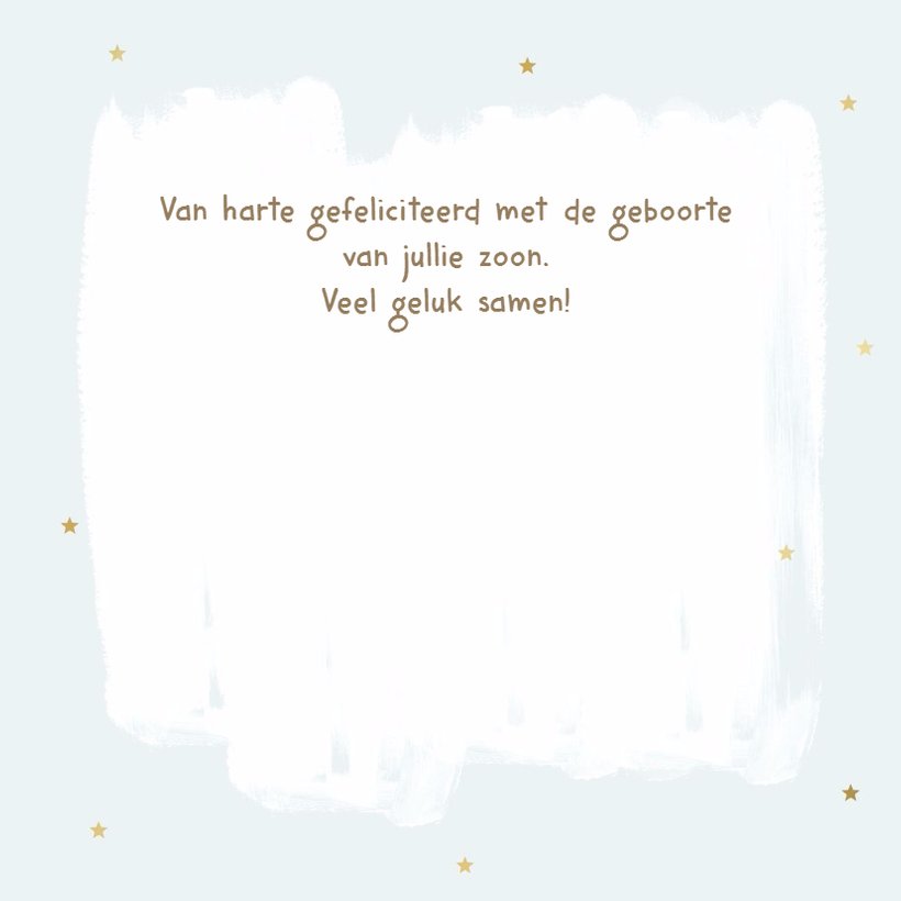 Felicitatie geboorte zoon waterverf sterren Kaartje2go Felicitatiekaarten geboorte zoon. Heb jij het prachtige nieuws gehoord dat er een jongetje geboren is? Dan ben je bij Hallmark aan het juiste adres om de apetrotse ouders te feliciteren met de geboorte van hun zoon. Bij Hallmark verstuur je namelijk de leukste felicitatie geboorte zoon kaartjes eenvoudig en snel online.