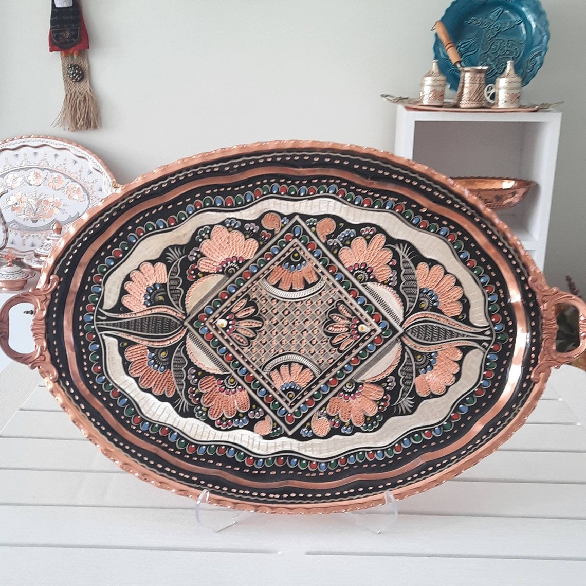 Turkish Copper Tray Turkish copper, Copper tray, Copper A Turkish copper tray, designed in the style, is generally a popular piece of furniture. How Much is a Turkish Copper Tray? A Turkish copper tray can differ in price owing to various characteristics — the average selling price 1stDibs is $2,500, while the lowest priced sells for $300 and the highest can go for as much as $4,500.